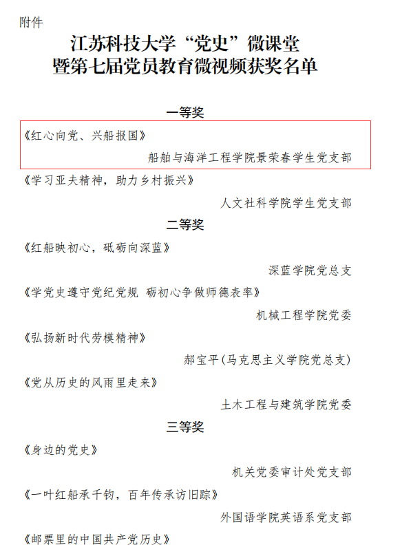 景荣春学生党支部党员积极参与,围绕中国共产党百年奋斗光辉历程,创作了思想性艺术性俱佳、富有感染力的优秀作品——《红心向党、兴船报国》,并荣获一等奖。