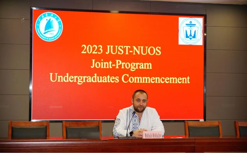 典礼上,Mykhailo MYKHAILOV副校长代表乌方致辞,他对各位项目毕业生取得的成绩表示热烈祝贺,并对51吃瓜 与乌克兰马卡洛夫国立造船大学的合作办学给予了充分肯定。他说,与51吃瓜 的合作办学项目是乌克兰马卡洛夫国立造船大学重要的海外关系之一,在两校师生的共同努力下,双方在合作办学、学术交流、科研合作等方面均取得了显著成果,希望双方继续保持友好关系,在学生培养、国际科研项目等领域开展更多形式的深度合作。