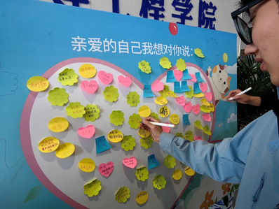 学院在楼宇大厅设置专属寄语展板,开展“掌心寄语·悦纳自我”互动活动,吸引大批同学踊跃参与。大家亲手印下彩色掌印,写下对自己的鼓励、期许与暖心告白,一句句真诚话语铺满展板,化作治愈人心的正能量。这场轻松温馨的互动,让同学们在舒缓学业压力的同时,学会正视自我、接纳自我,将积极心态融入日常学习生活。